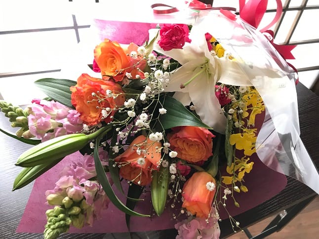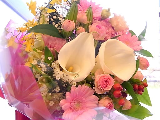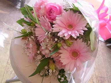 花がギュッとつまった可愛いイメージの花束です。ラッピングを外せばそのまま花瓶に入れて飾れます。持ち運びに便利です。