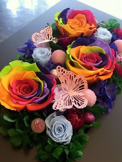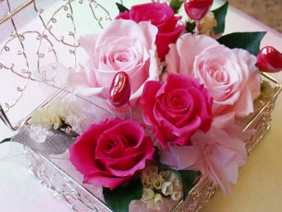「保存されたお花」という意味があるプリザーブドフラワー。枯れることがなく水やりの必要もないことが特徴で、特別な染料を用いて作られるため、生花にはない豊富な色味を表現できます。陶器ポットに生けたり、フォトフレームや壁飾りの一部として使用したりと、生花でのアレンジメントとは一味違った楽しみ方ができます。