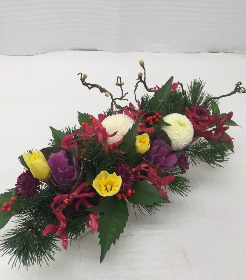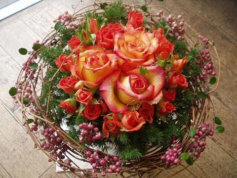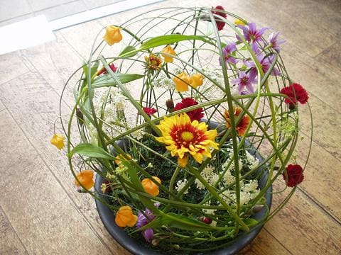 点を1箇所に集めた広がるようなスタイルです。花の種類を選ばない一般的なアレンジメントです。