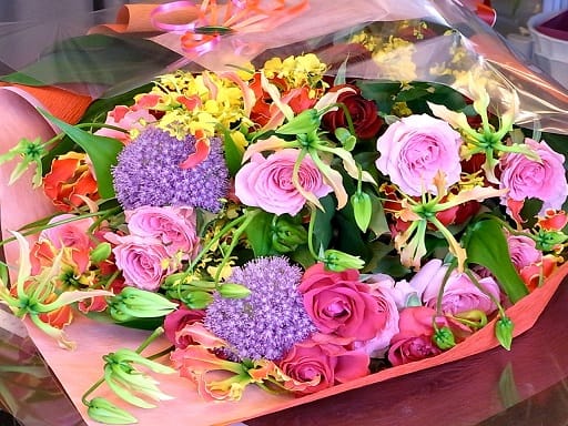花を長いまま束ねるのでボリュームがあります。式典やステージなどで見栄えする花束です。